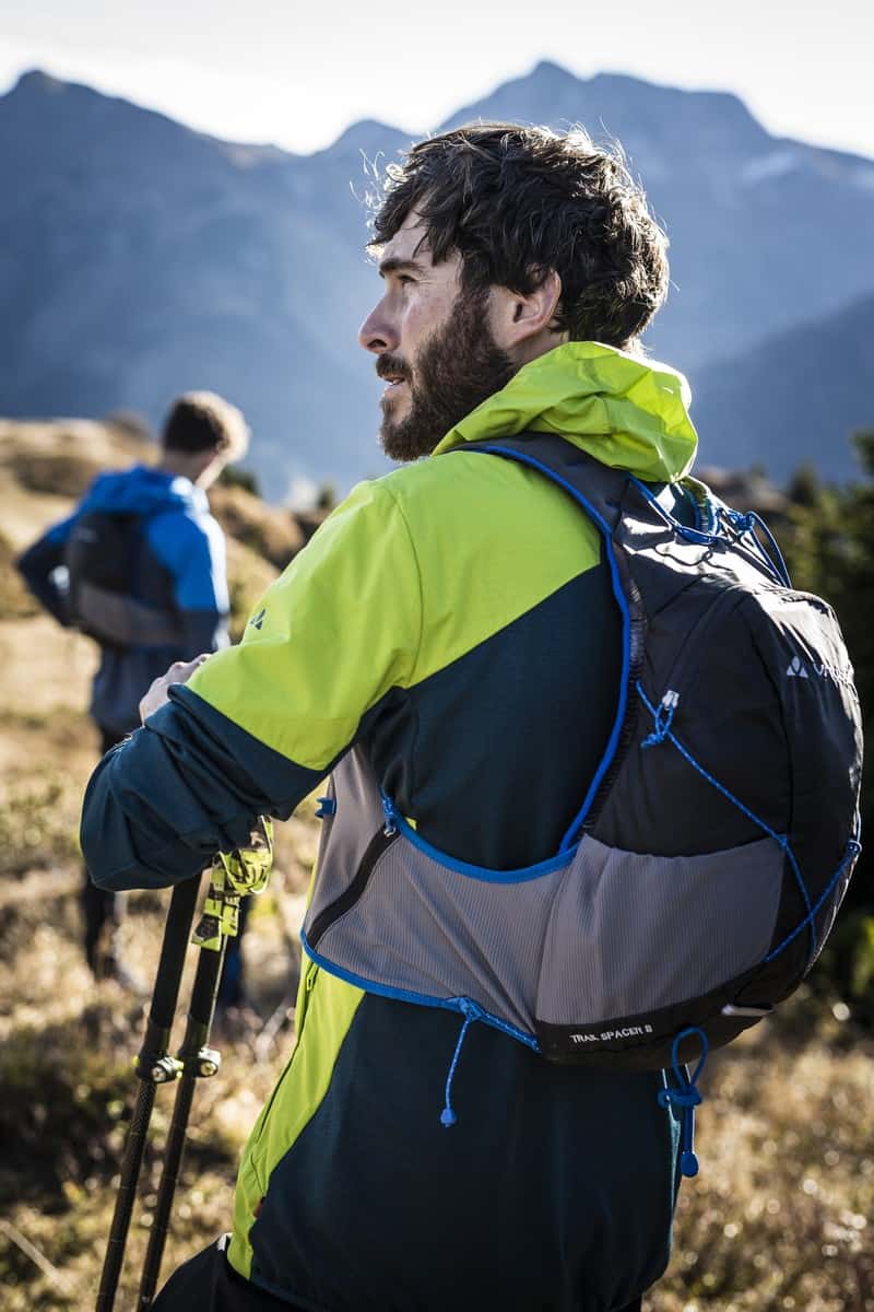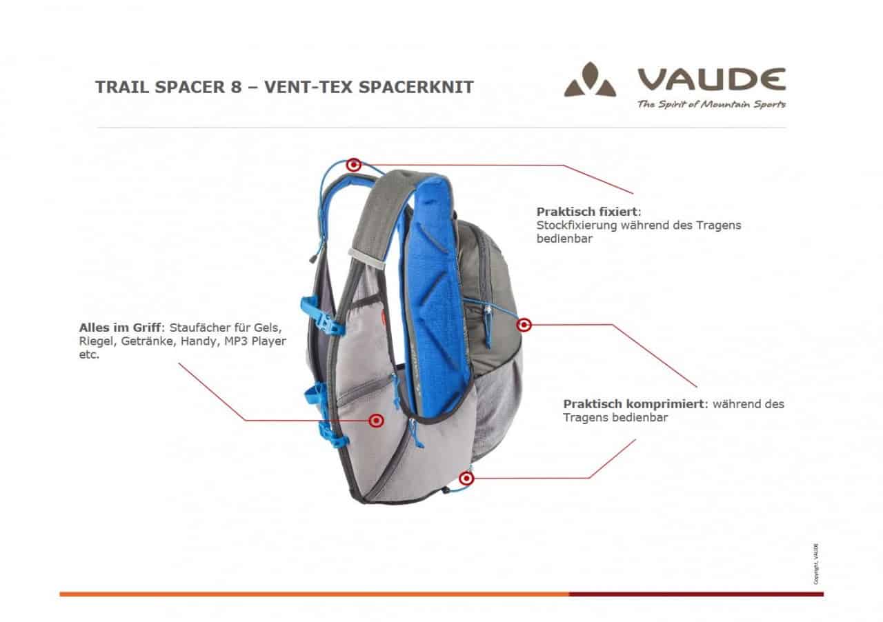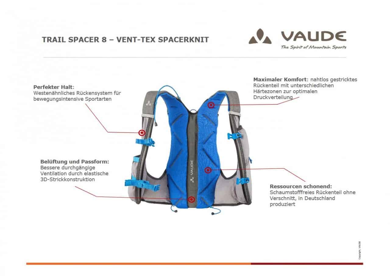 La espalda y los tirantes están diseñados y fabricados con confección de punto sin costuras con la Tecnología 3-D Spacer para un acolchado confortable y una buena ventilación – Material exterior siliconado ultraligero y muy resistente – Bolsillos incorporados en los tirantes en malla elástica para geles, barritas energéticas, móvil, GPS – Compartimiento en malla elástica para bidón en el tirante – 2 accesos laterales en malla elástica – Sistema de compresión y fijación combinado accesible en marcha – Bolsillo interior con cierre de cremallera – Elementos reflectantes y anclaje para la luz – Aperturas para el sistema de hidratación – Sistema rápido de fijación para el transporte de los bastones telescópicos – Sello de garantía de sostenibilidad de GREEN SHAPE de VAUDE.