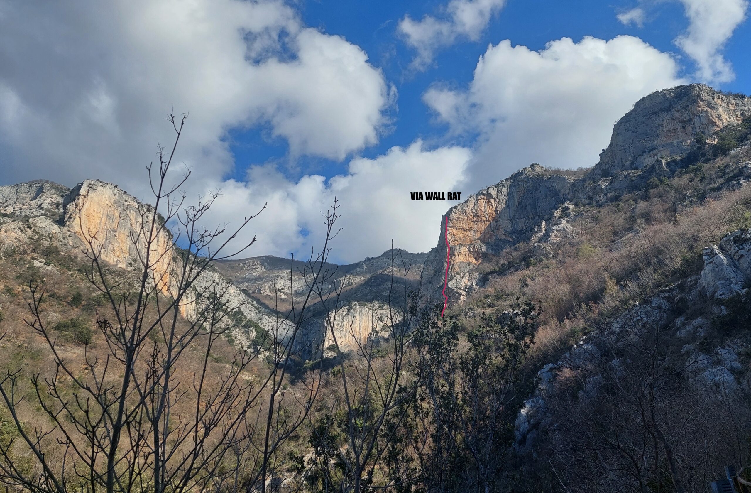 Aproximación: Salimos del parking en sentido ascendente por el valle de “Vero”, un camino señalizado con marcas rojas y amarillas que recorre algunos de los sectores de escalada deportiva. Al cabo de unos 20´ abandonamos el camino para subir por un pequeño sendero que no lleva a pie de pared. La cual es visible durante la aproximación.