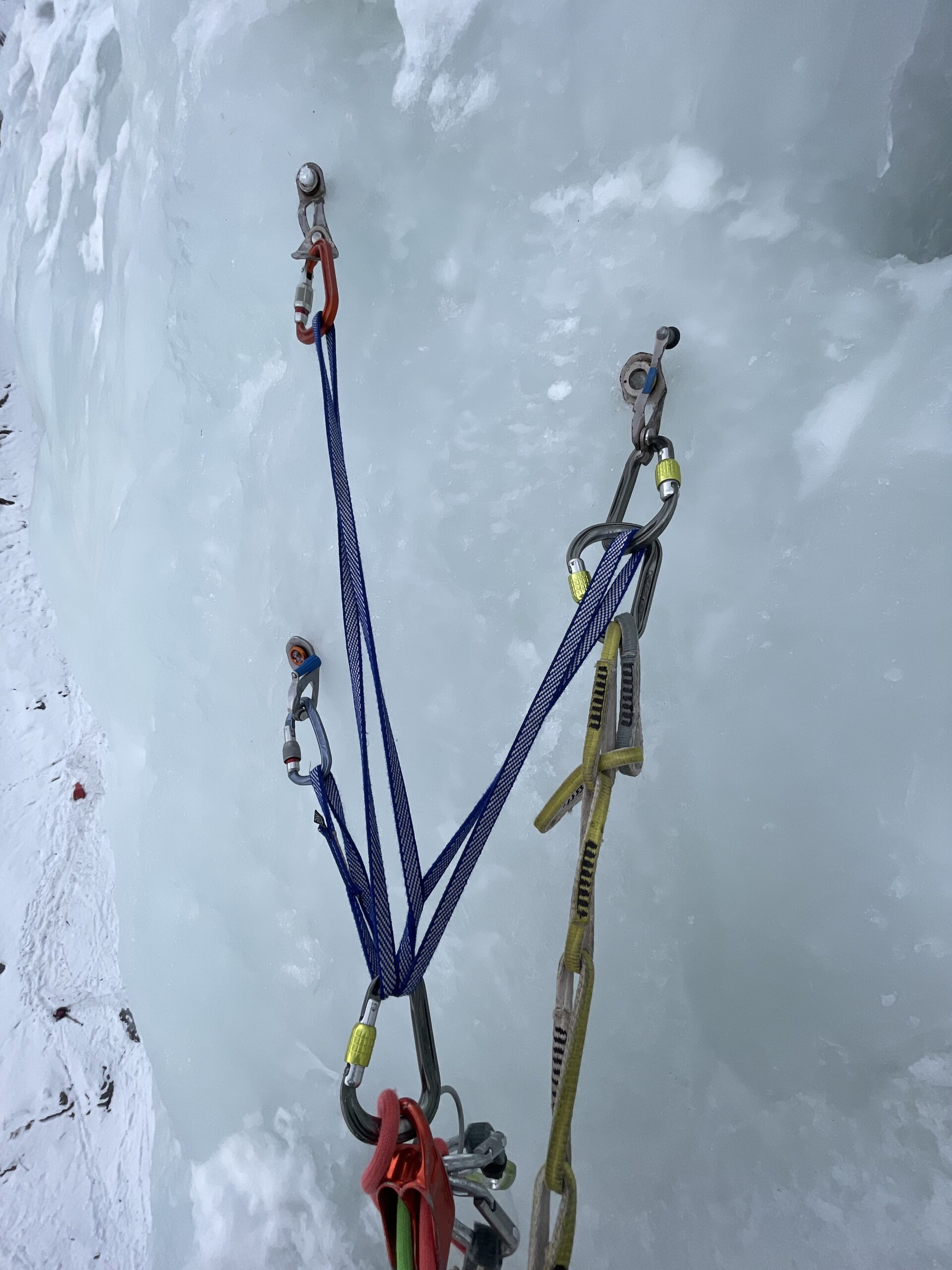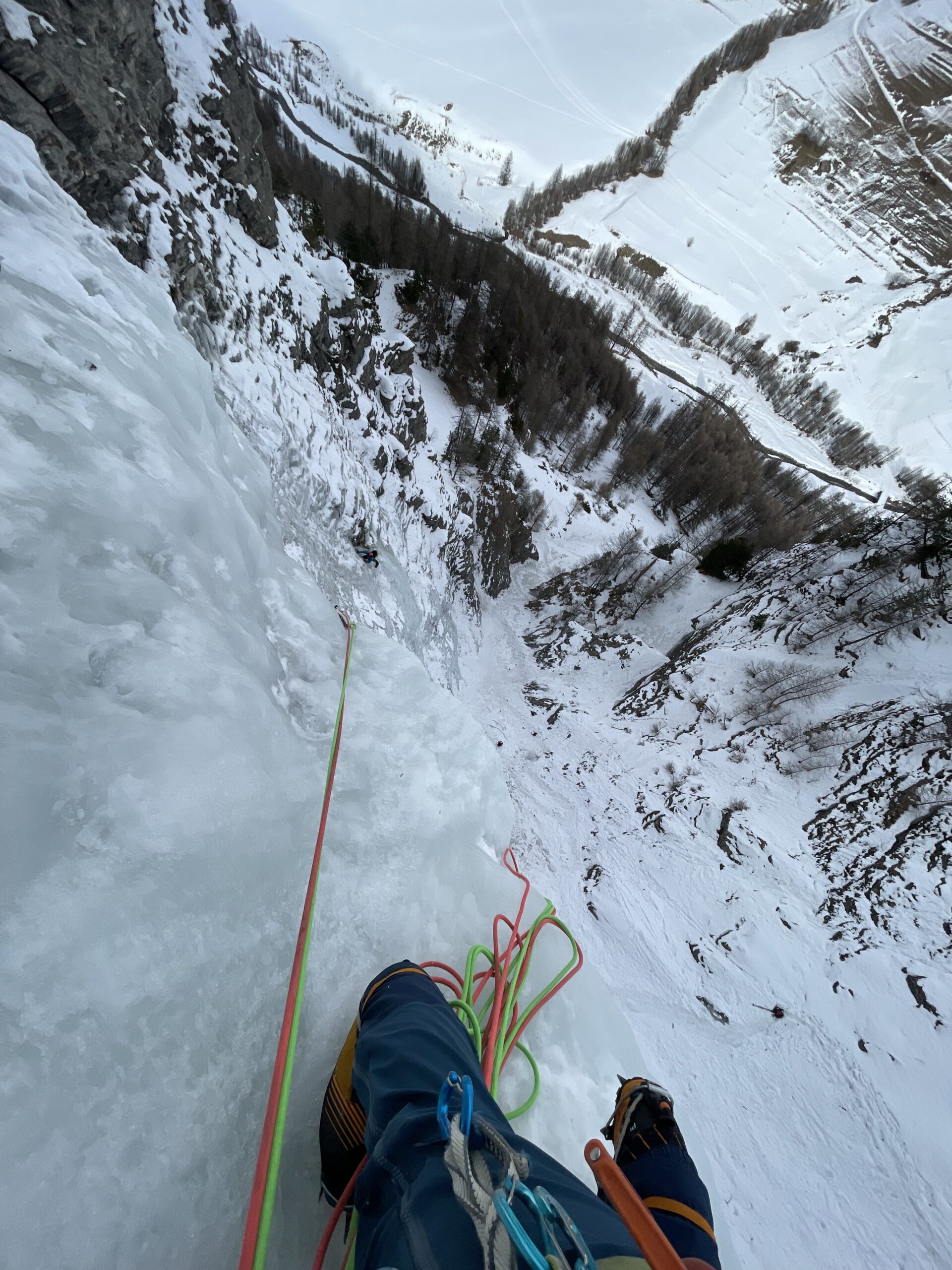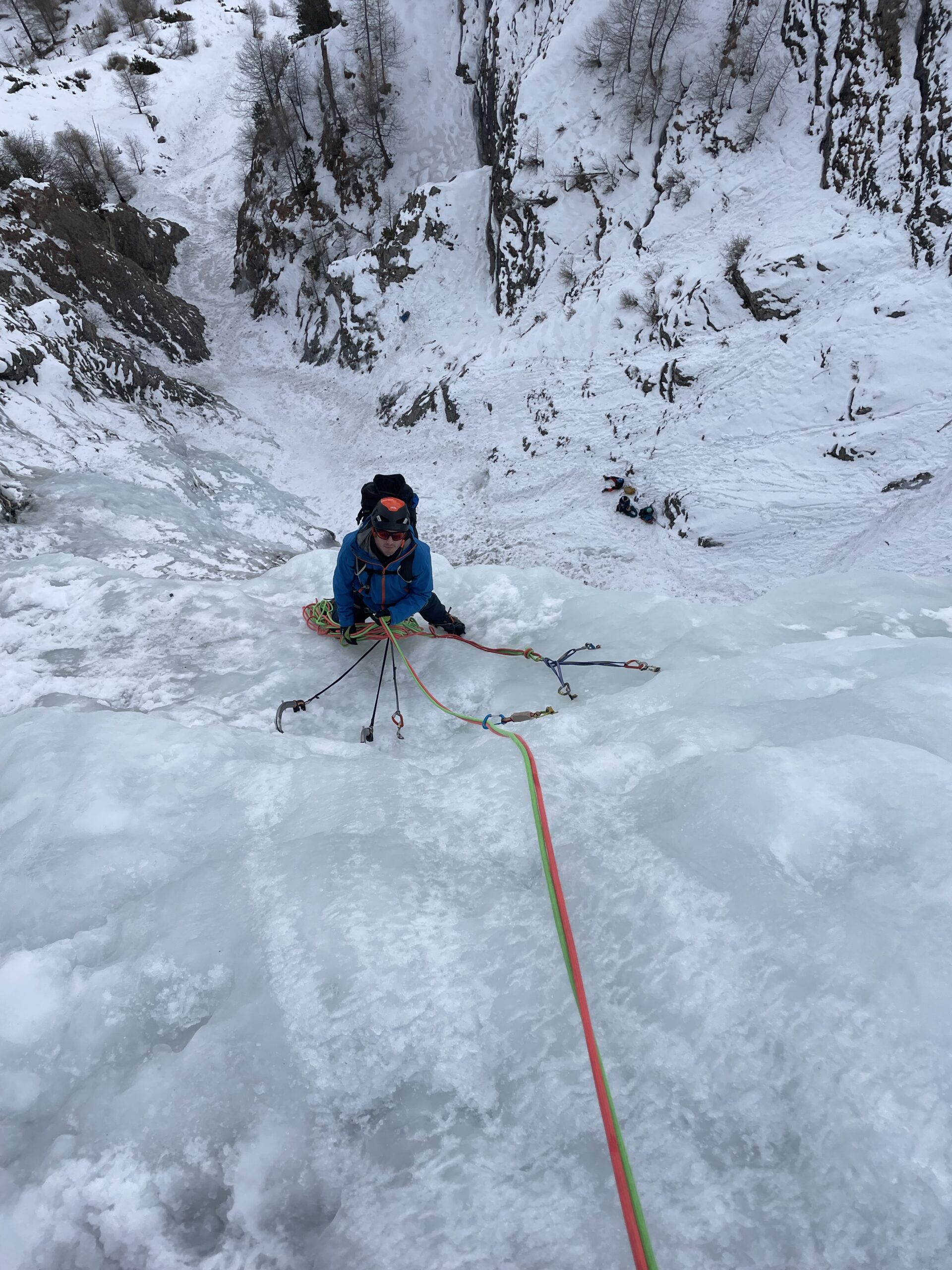 A nosotros nos pareció buena y en condiciones la placage de gauche, en casi todas las vías hay gente así que no hay prisa, a partir de mediodía a la parte superior, en febrero, les entra el sol, vigilad la temperatura. En la mayoría de vías no hay reuniones equipadas, o serán árboles o las tendremos que montar nosotros en hielo. El descenso se hace a pie o rapelando, eso ya vosotros mismos podéis decidir.