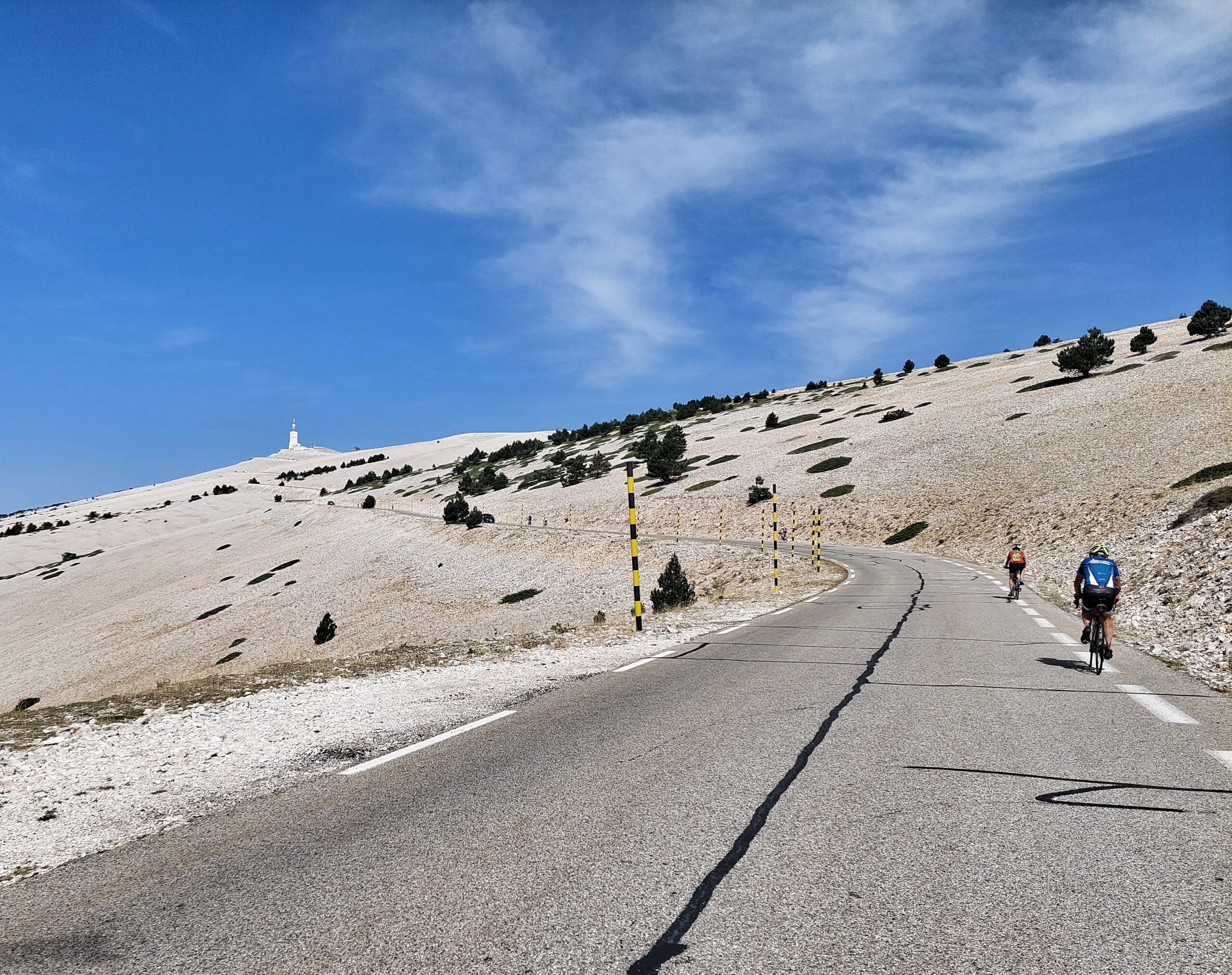 Es en los últimos 6 quilómetros donde se endurece el tema y el escenario cambia. La carretera se empina y aparece ese paisaje rocoso, blanco y brillante tan característico del Ventoux. Ya cerca de coronar, sus últimos 3 quilómetors al 10% nos exigen un último esfuerzo antes de la recompensa de pisar la cima .