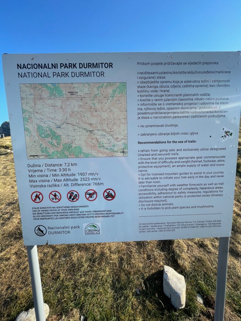 Nos levantamos temprano, conducimos unos quince minutos hasta Sedlo Mountain pass, donde hay un pequeño parquin y desde donde empieza la ruta de ascensión. Justo aquí ya encontramos un cartel informativo de la zona y de ascensión al bobotov kuk.