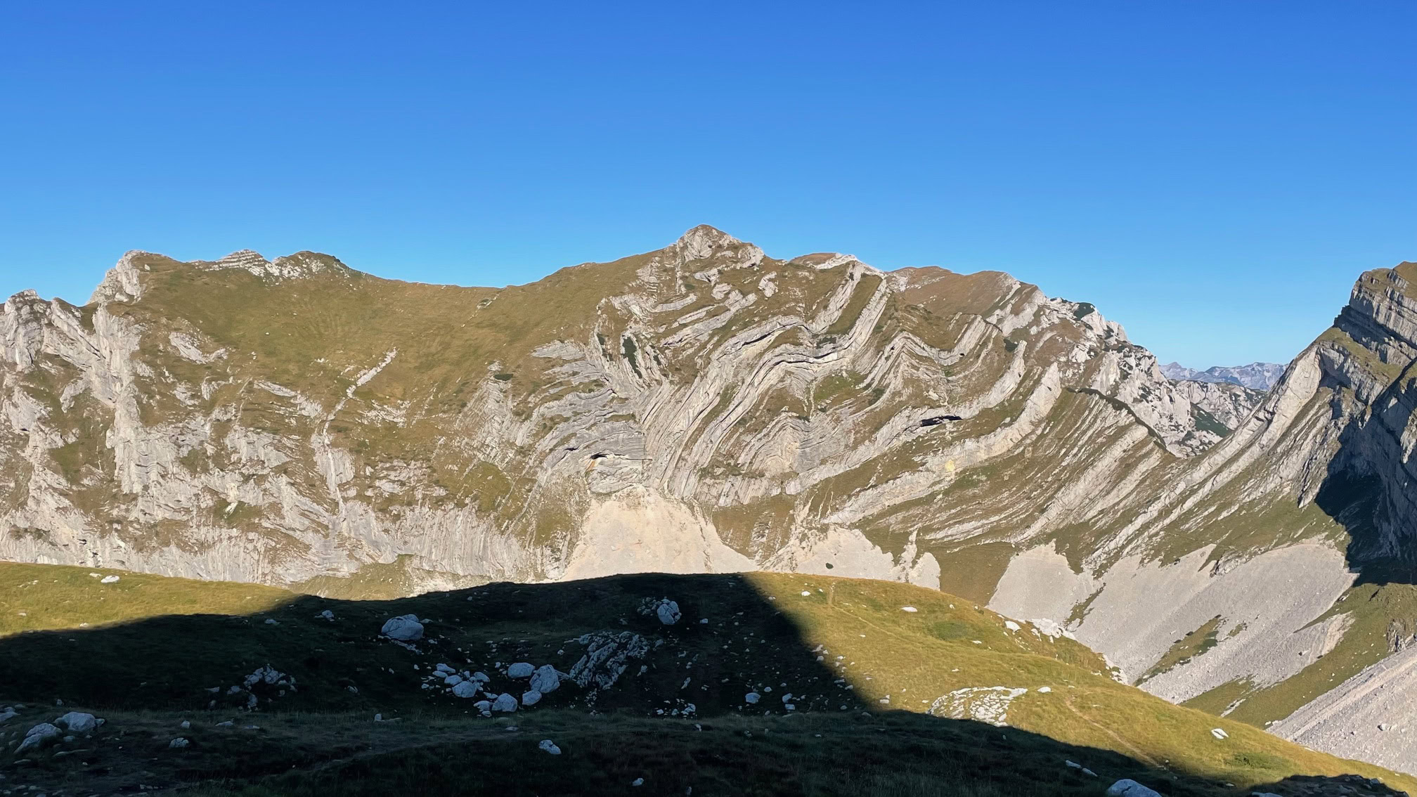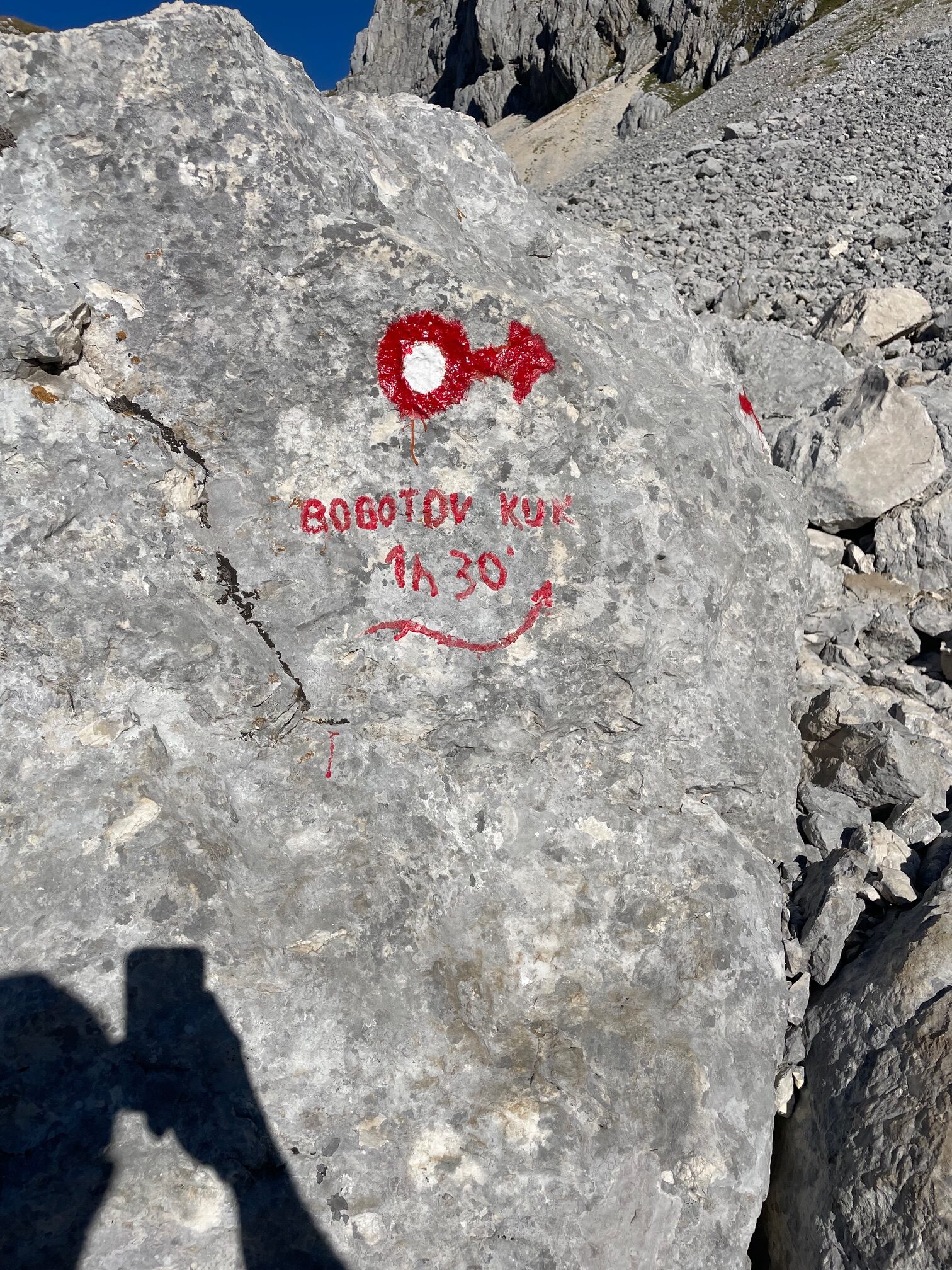 La ruta empieza suave y en unos diez minutos ya encontramos los primeros pasos equipados con cadenas para superar una barrera rocosa, no es difícil, pero hay que estar un poco atentos. Una vez pasado este tramo, en un sube y baja mantenido y bonitas vistas de la zona, observando sus formaciones geológicas muy interesantes, nos aparece una montaña, justo delante, con un subidón tremendo, el cual deseamos que no sea el Bobotov… y si, está claro, es el mismo….