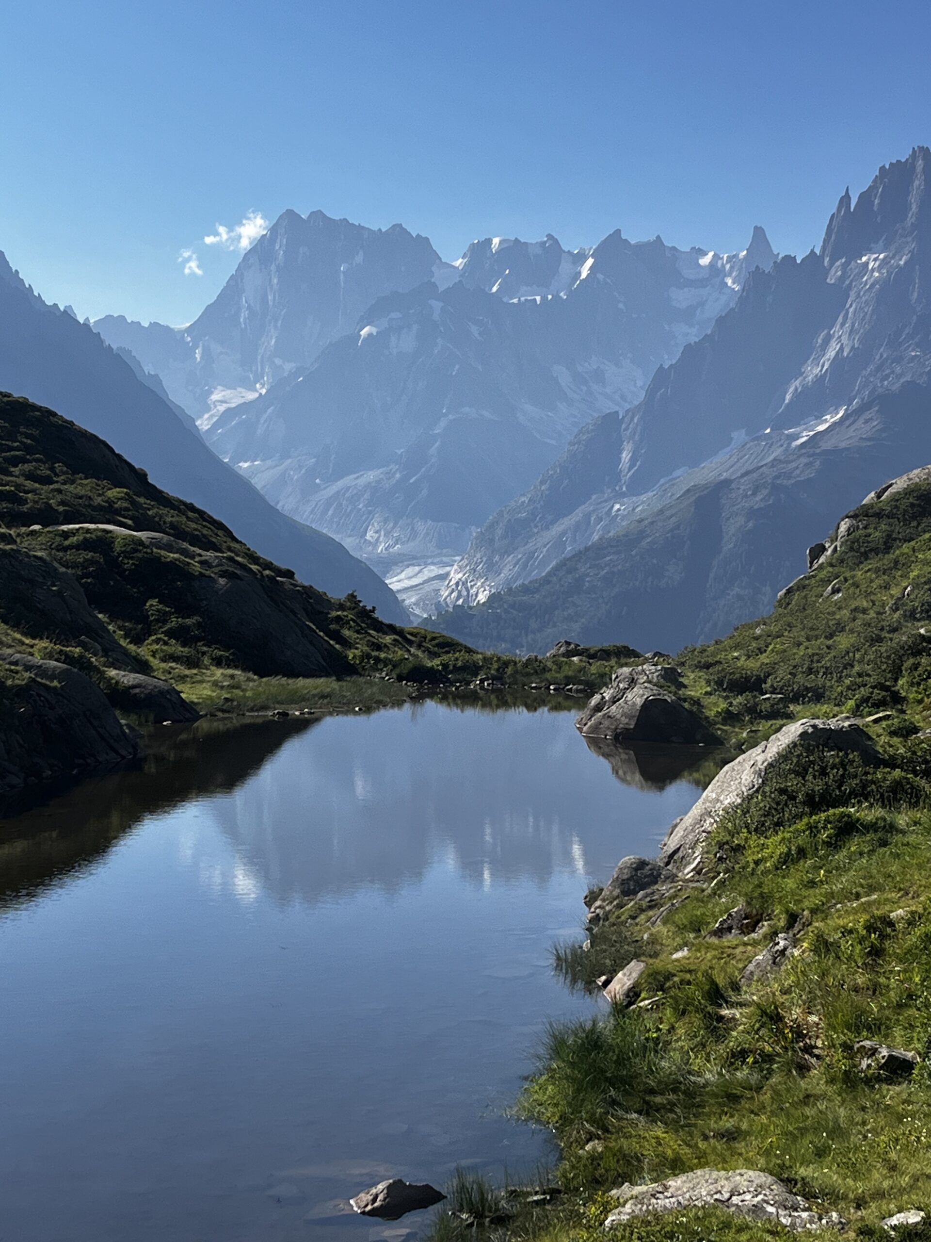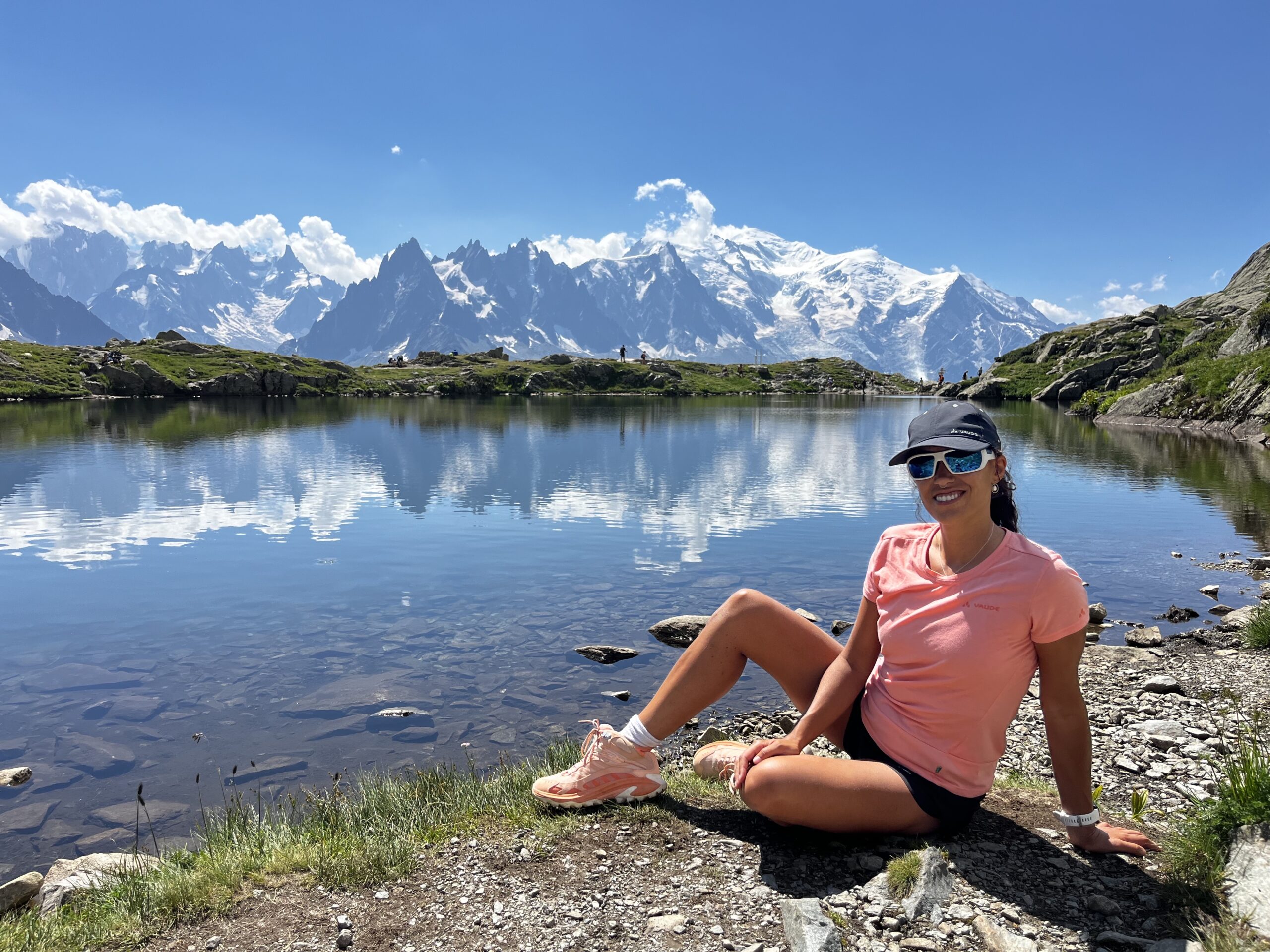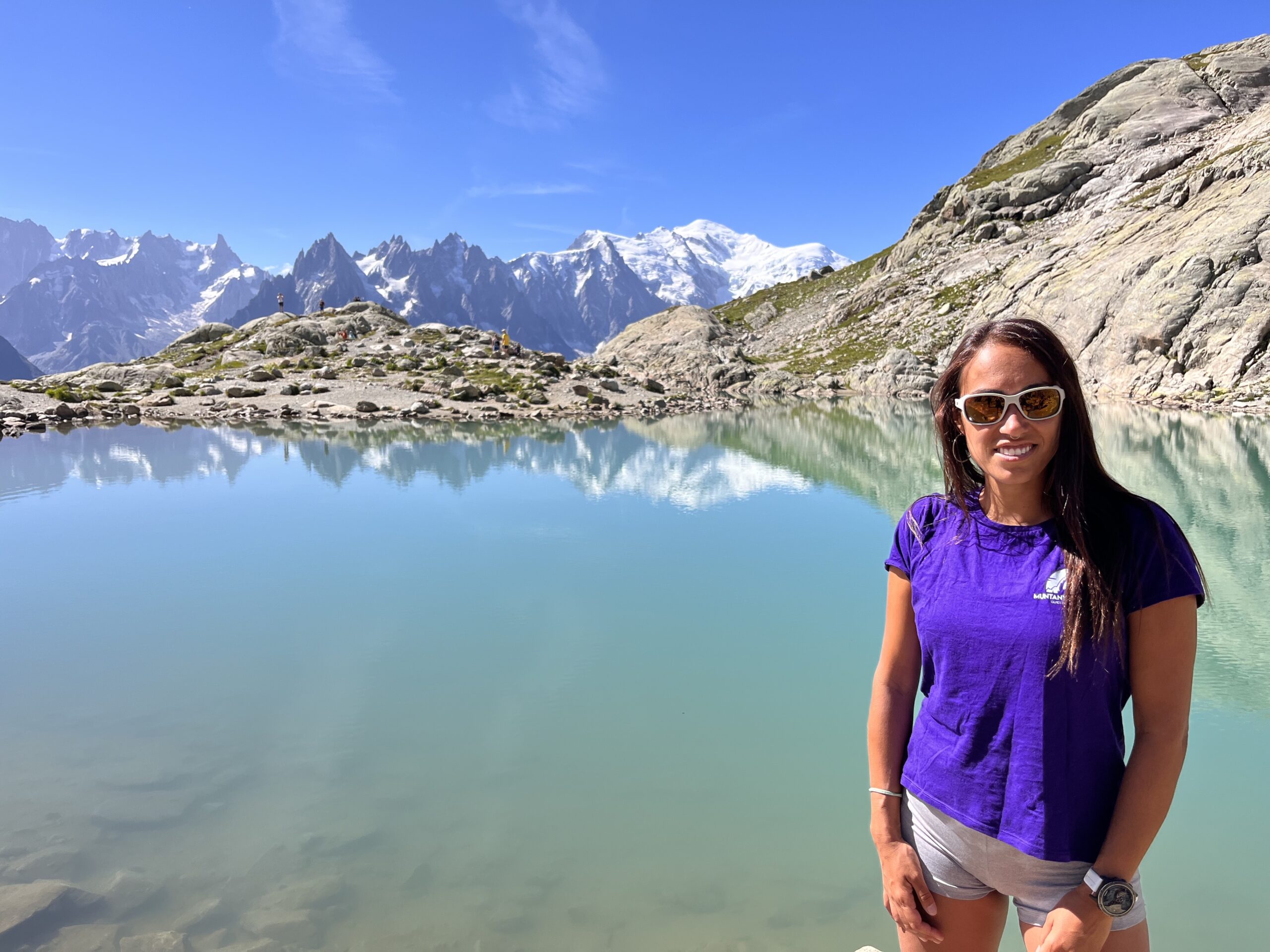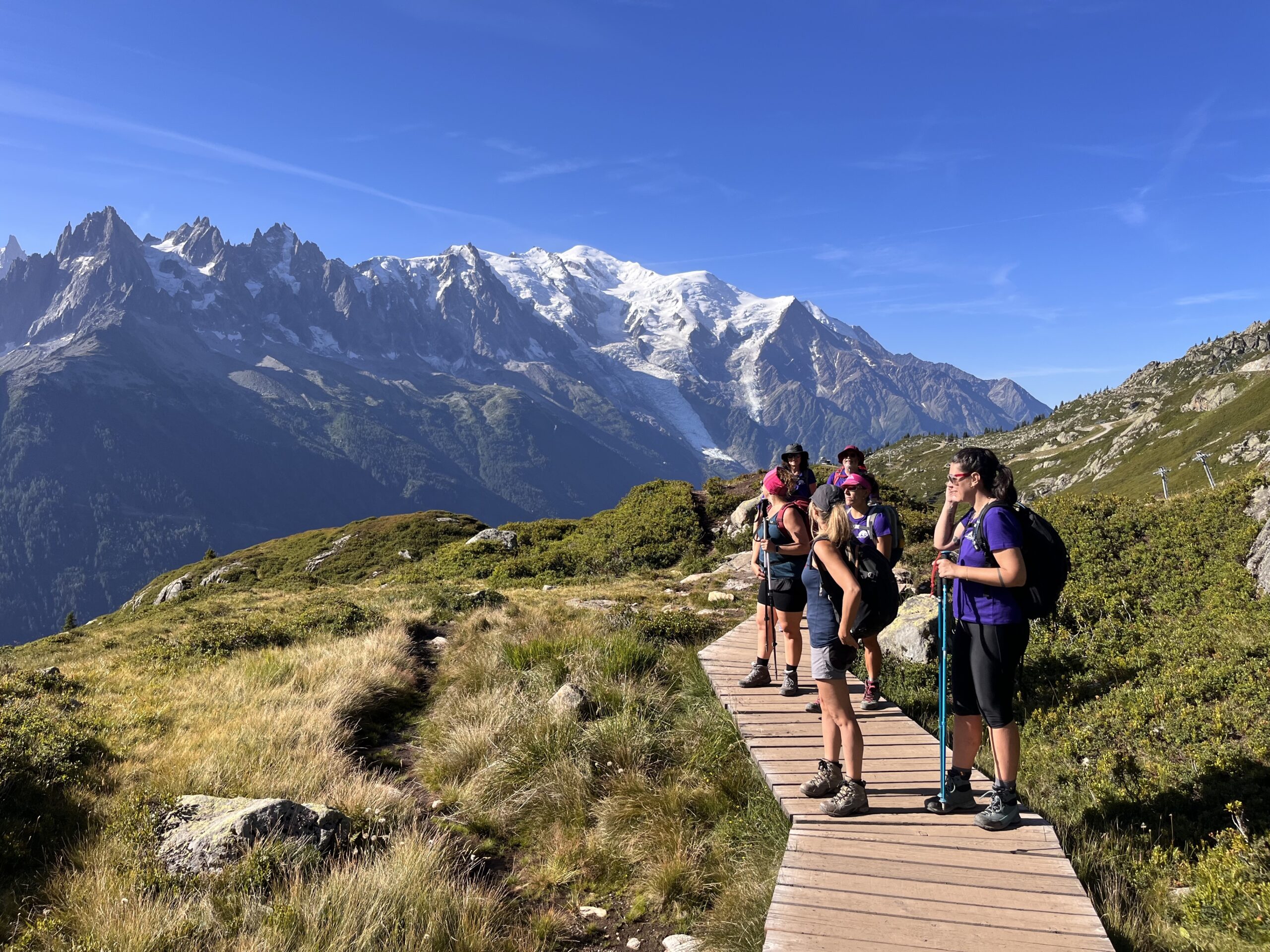 Los Lacs des Chéserys, una serie de pequeños lagos con aguas cristalinas. Este tramo es relativamente fácil y a medida que caminas, las vistas del Mont Blanc y el valle de Chamonix son impresionantes, no solo directamente sino viendo también su refeljo en estas aguas critalinas de montaña. El regreso sigue siendo muy marcado hacia La Flégère y con vistas a todo el mazico del Montblanc, pasamos por tramos también de la conodida ultra Trail del montblanc (UTMB)