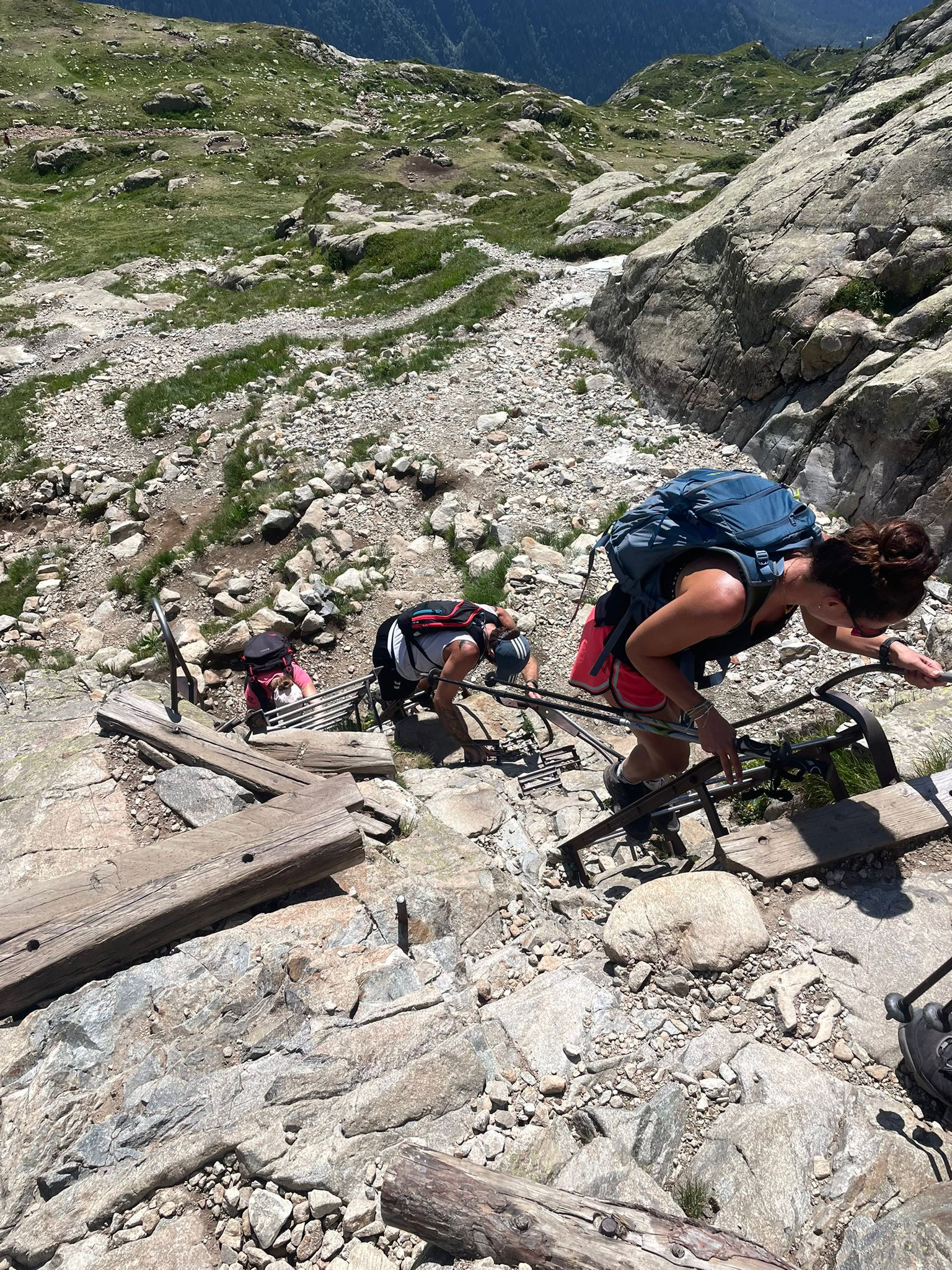Hay un refugio de montaña que es el único punto de la ruta donde podríamos repostar agua, y no siempre está abierto, consultad las condiciones antes de salir. Seguiremos dirección los lagos de cheserys. Este sendero inicia el descennso hacia los lagos. Esta parte de la caminata es un poco más empinada, con algunas partes que requieren usar las manos para trepar por las rocas, y algunas escaleras verticales aunque está bien asegurada.