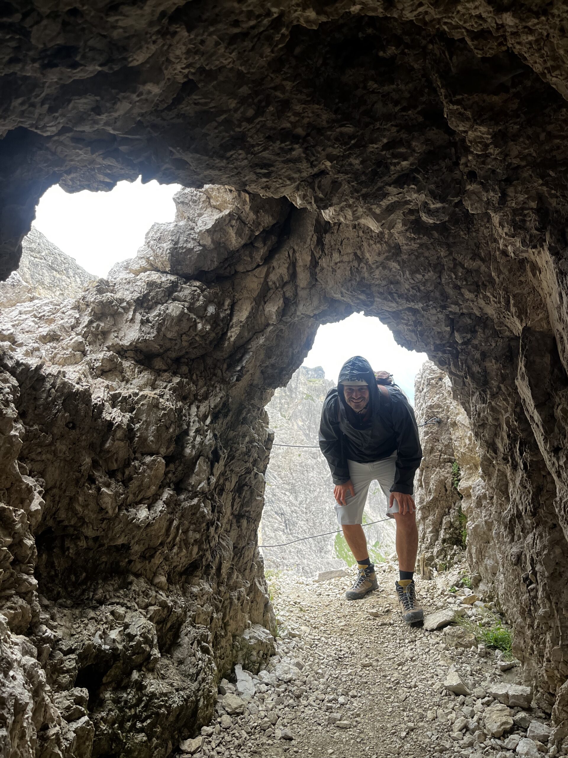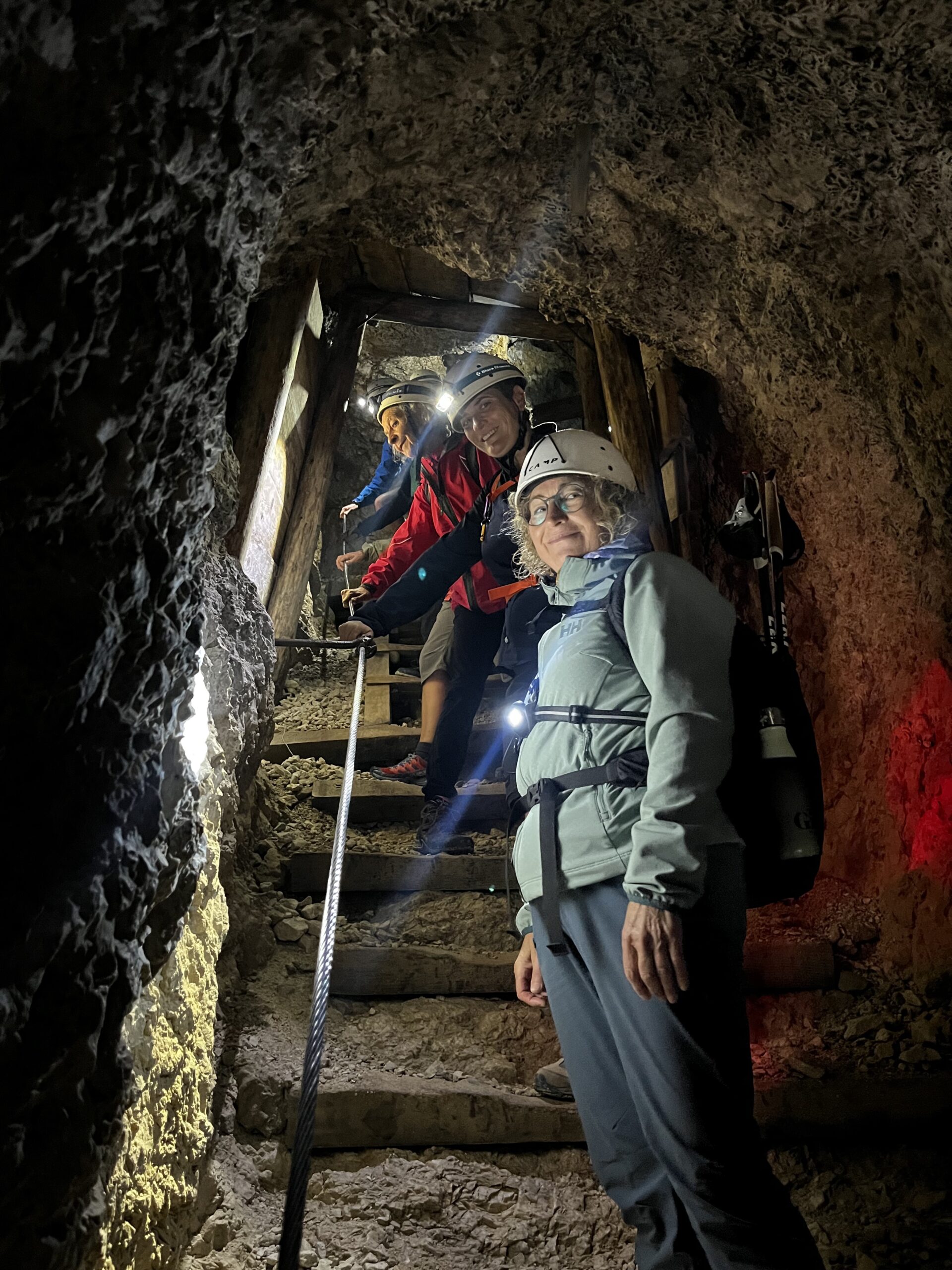 Desde la cima del Pico Lagazuoi se tienen unas de las vistas más impresionantes de los Dolomitas. Podrás contemplar picos famosos como las Cinque Torri, Tofana di Rozes y el Monte Civetta, la Marmolada, el Piz boe… y ver sus formas geológicas glaciares en el fondo del valle En la cumbre hay un refugio (Refugio Lagazuoi), donde puedes hacer una pausa para disfrutar de comida típica de montaña o simplemente descansar mientras admiras el paisaje, nosotros siempre recomendamos la zupa d’orzo (sopa caliente )y el strudle (dulce de manzana, pasas y piñones). La parte mas impresionante es la bajada. El descenso por las Galerías Austriacas (Gallerie del Lagazuoi), una red de túneles excavados en la roca durante la Primera Guerra Mundial. Este sistema de galerías fue utilizado por las tropas austriacas para moverse de forma segura y defender sus posiciones.