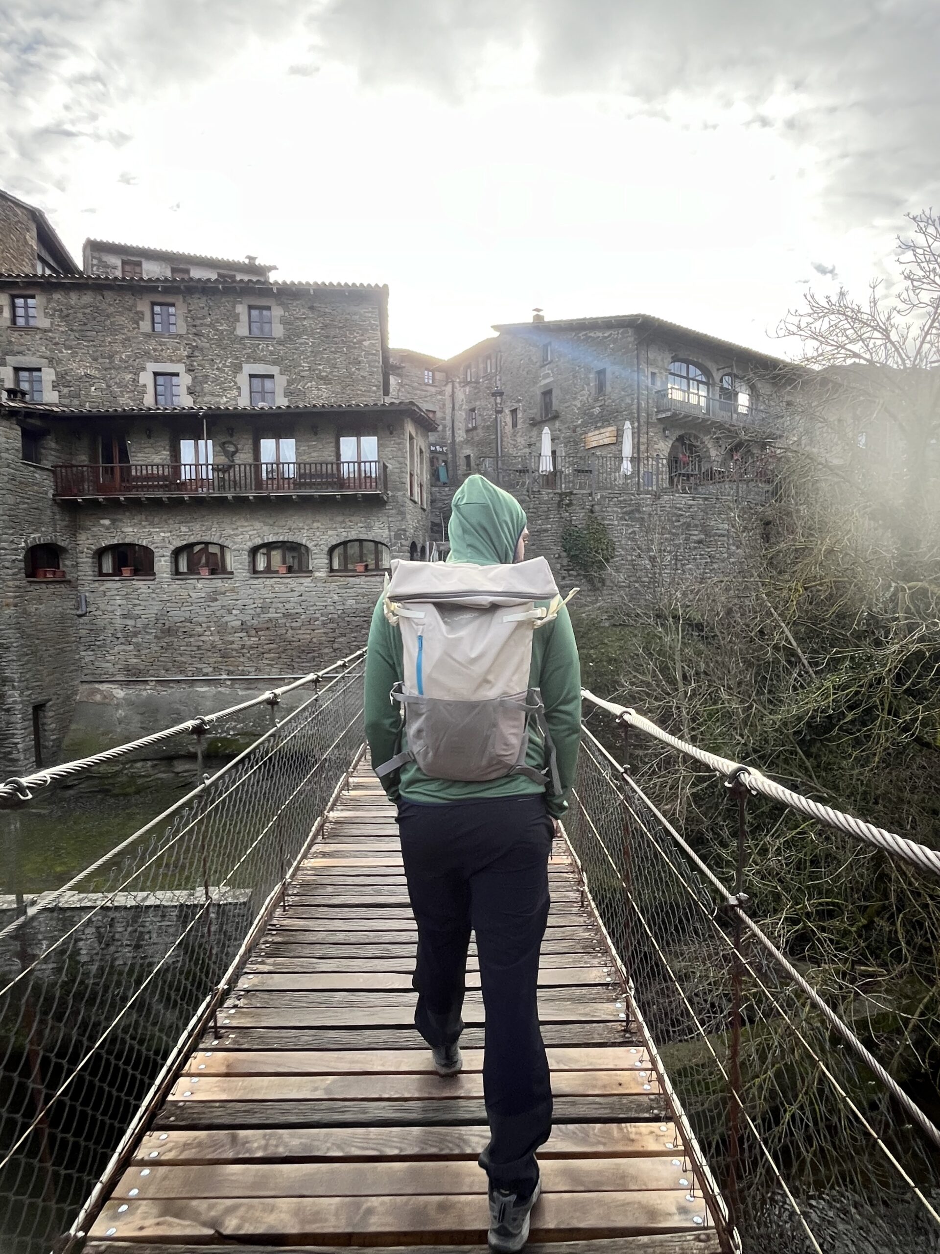 La ruta comienza en el pintoresco pueblo de Rupit, conocido por sus calles empedradas, casas de piedra y su puente colgante para acceder al pueblo. Antes de comenzar la caminata, vale la pena pasear por el pueblo para disfrutar de su arquitectura medieval.