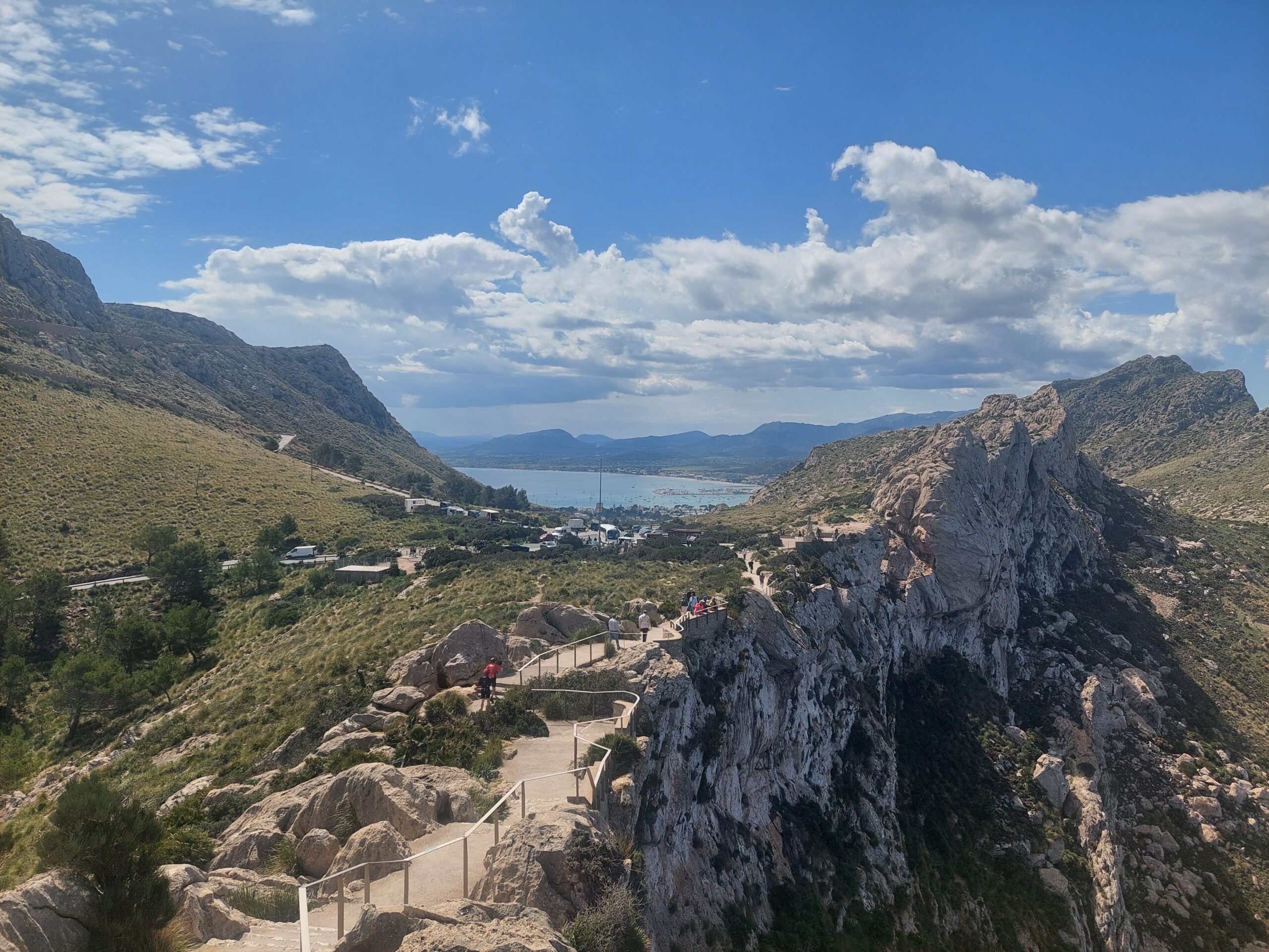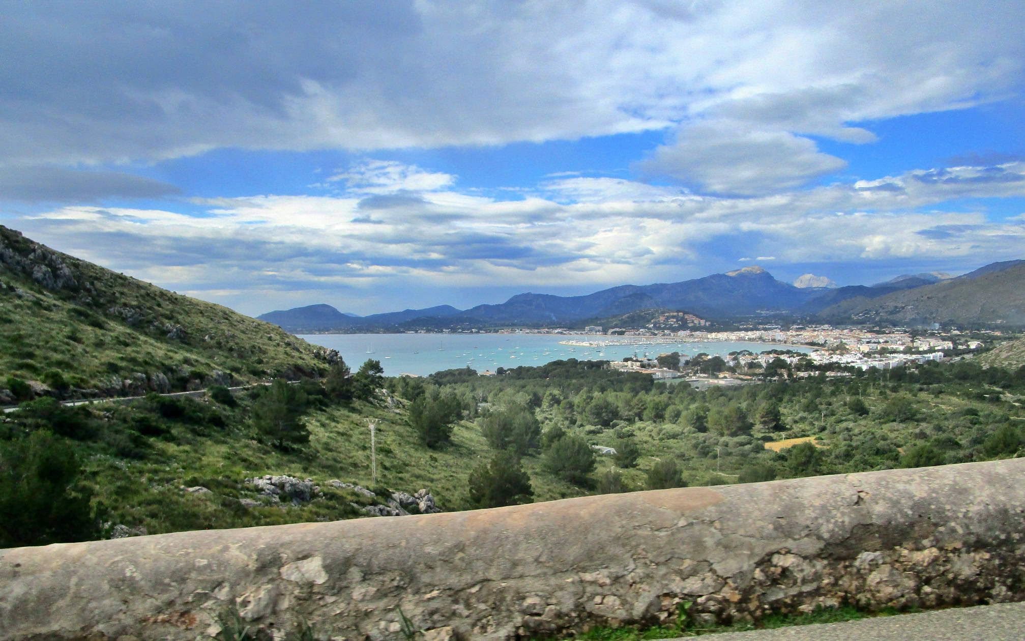 Tras las fotos de rigor en el faro, iniciamos el regreso: bajar lo subido y subir lo bajado. Esta vez sí paramos en el Mirador de Es Colomer, que no decepciona. Teníamos previsto subir a la Talaia d’Albercutx, que parte desde el Coll de la Creueta. Es una ascensión corta pero intensa que culmina en una antigua torre de vigilancia con vistas espectaculares. Sin embargo, no fue posible, ya que la carretera estaba cortada por el rodaje de una película. Ya de vuelta hacia Pollença, y antes de llegar al pueblo, tomamos un desvío en dirección al puerto. Circulamos unos kilómetros por la carretera general hacia Alcúdia. Aunque es una vía bastante transitada, cuenta con un arcén amplio que permite rodar con seguridad.
