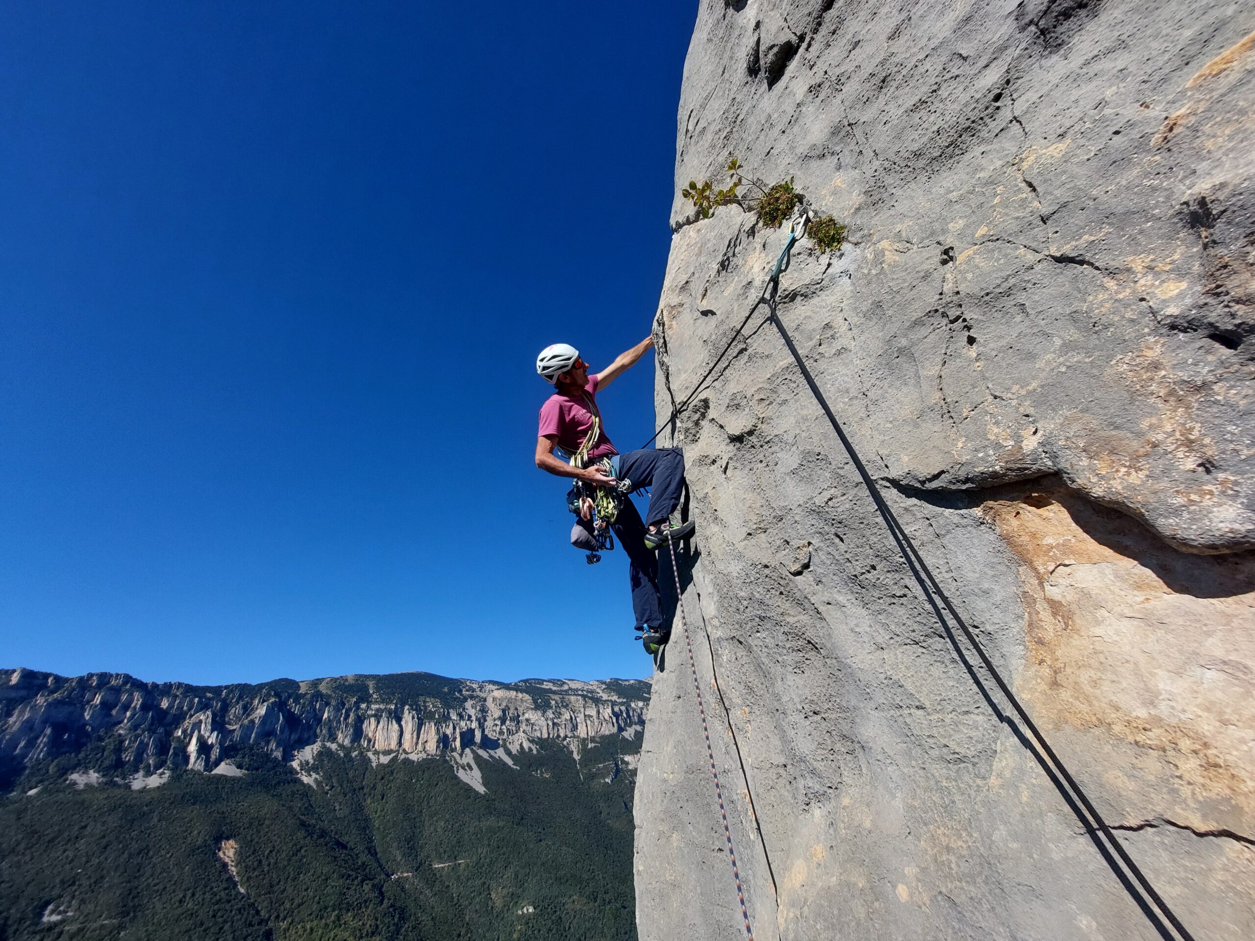El itinerario nos regala un escenario privilegiado con panorámicas brutales sobre el Diois y el circo de Archiane, todo un espectáculo natural que acompaña cada movimiento en la pared.