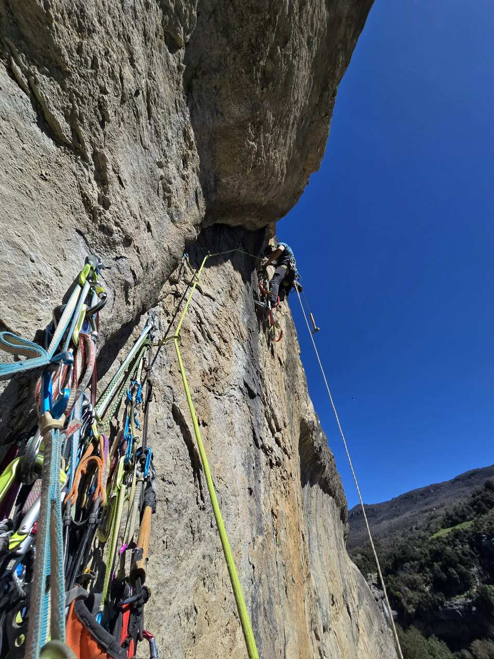 L2: sale Pelut. Le espera una buena trabe, muy guapa y de currar… La roca ha mejorado, pero estamos en Tavertet y la roca es la que hay. Pitón, pitón, ancla, pitón, friend, ancla, chapa… Pelut en estado puro: risas, fotos, canciones… y otro A3+ para la comarca.