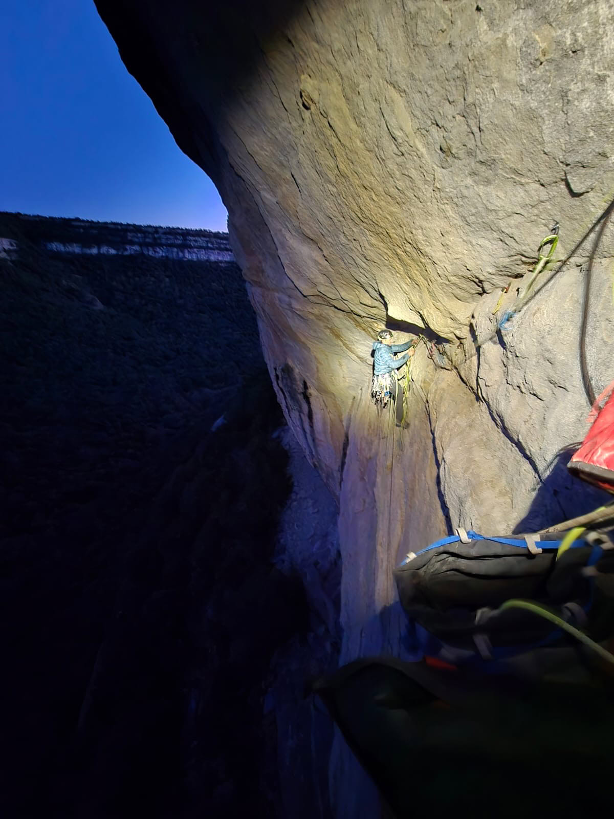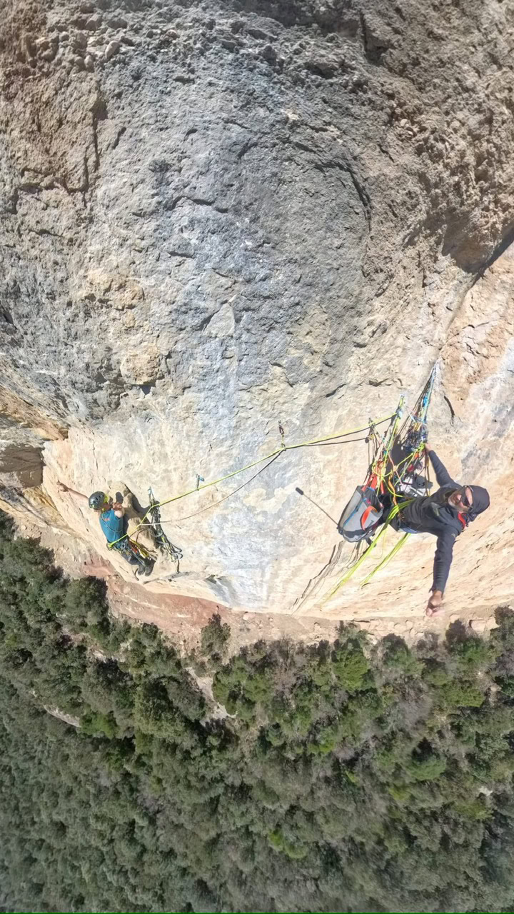Empezamos tarde a escalar y el primer día hacemos dos largos. De fácil, nada; y de rápida, la vía tampoco… todo bien. Acabamos con el frontal. El segundo día intentamos escalar más rápido: empezamos más temprano, pero al final terminamos a las siete de la tarde. Eso sí, ultra contentos y motivados; creemos que ha salido una buena vía de artifo.