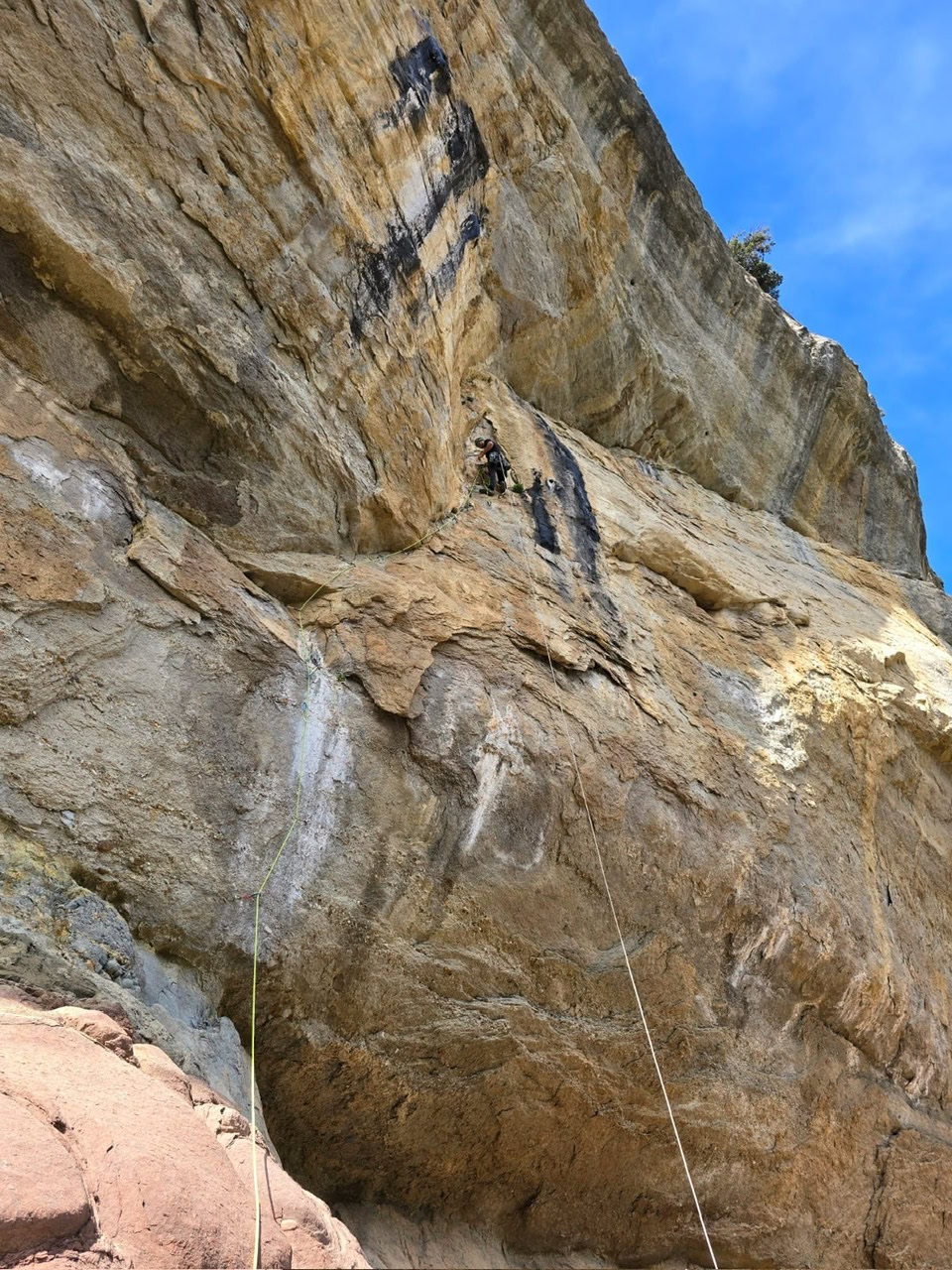 L1: empiezo yo. Cuatro chapas, dos puntas de ancla, cuatro chapas más y la roca se vuelve malísima… Con dudas de seguir para arriba, entre risas y miedo, jugando a ser artificiero, sale un buen A3 hasta la reunión.