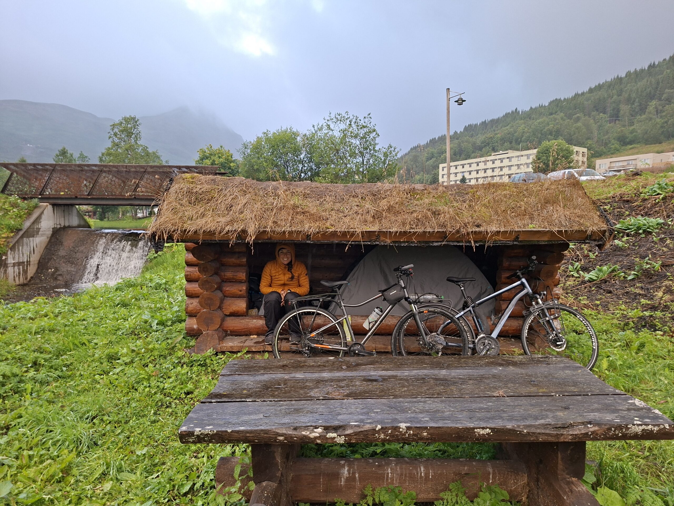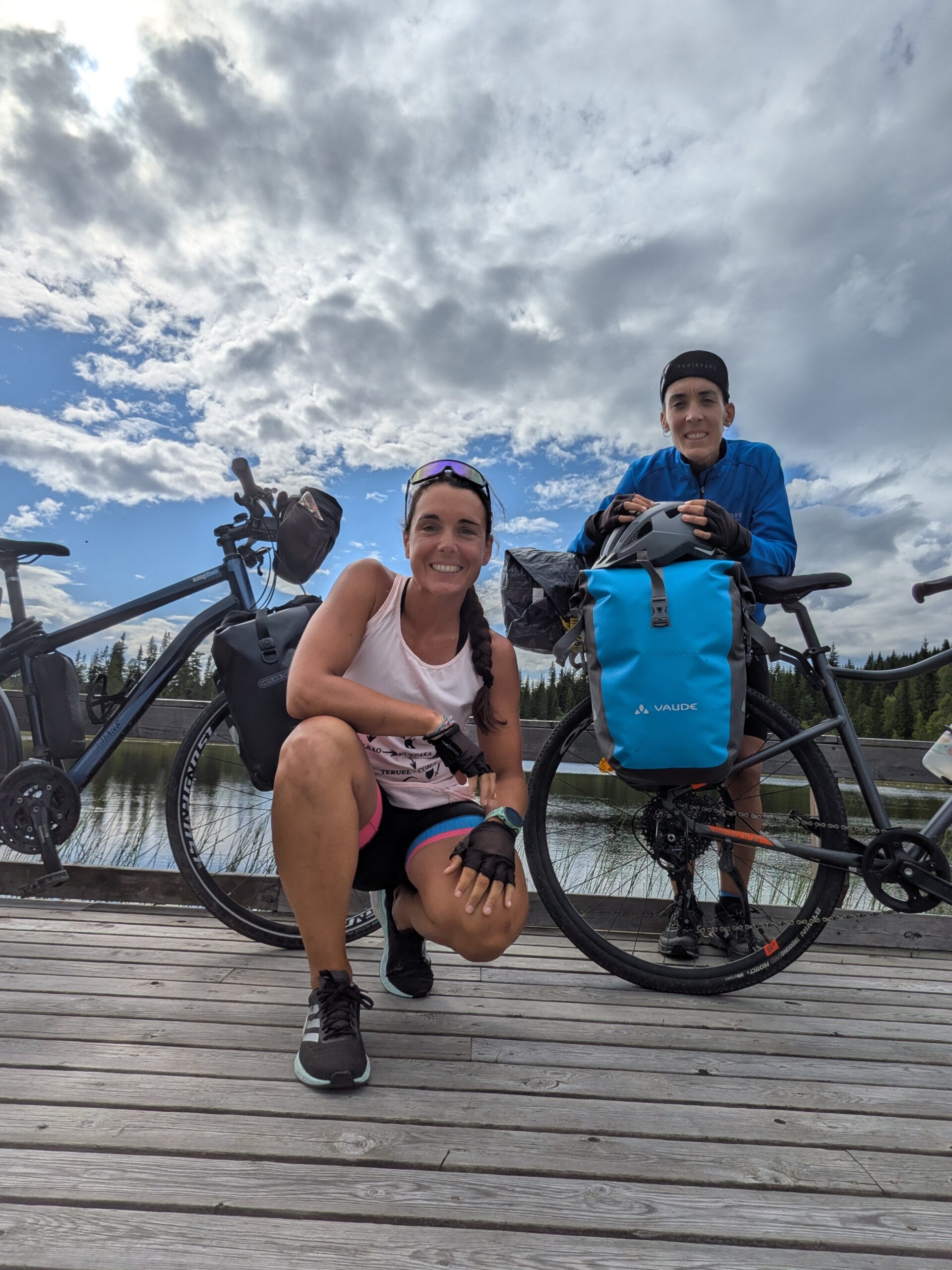 Para organizarnos en Noruega hubo tres aplicaciones imprescindibles: YR, para consultar el tiempo; Vildnis, para localizar refugios y shelters; y Mapy, que nos ayudó tanto a planificar etapas como a encontrar pequeñas cabañas o refugios turísticos donde resguardarnos cuando el cielo amenazaba lluvia. Noruega es verde, silenciosa y exigente. La mayor parte del recorrido es por asfalto y, aunque a veces compartimos carretera con coches, el tráfico es mínimo y el respeto hacia las ciclistas es absoluto. No te engañes: Noruega es muy grande.