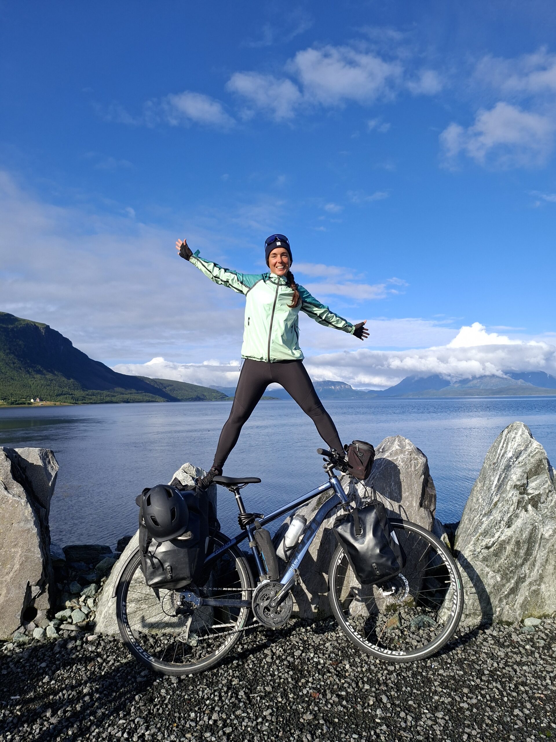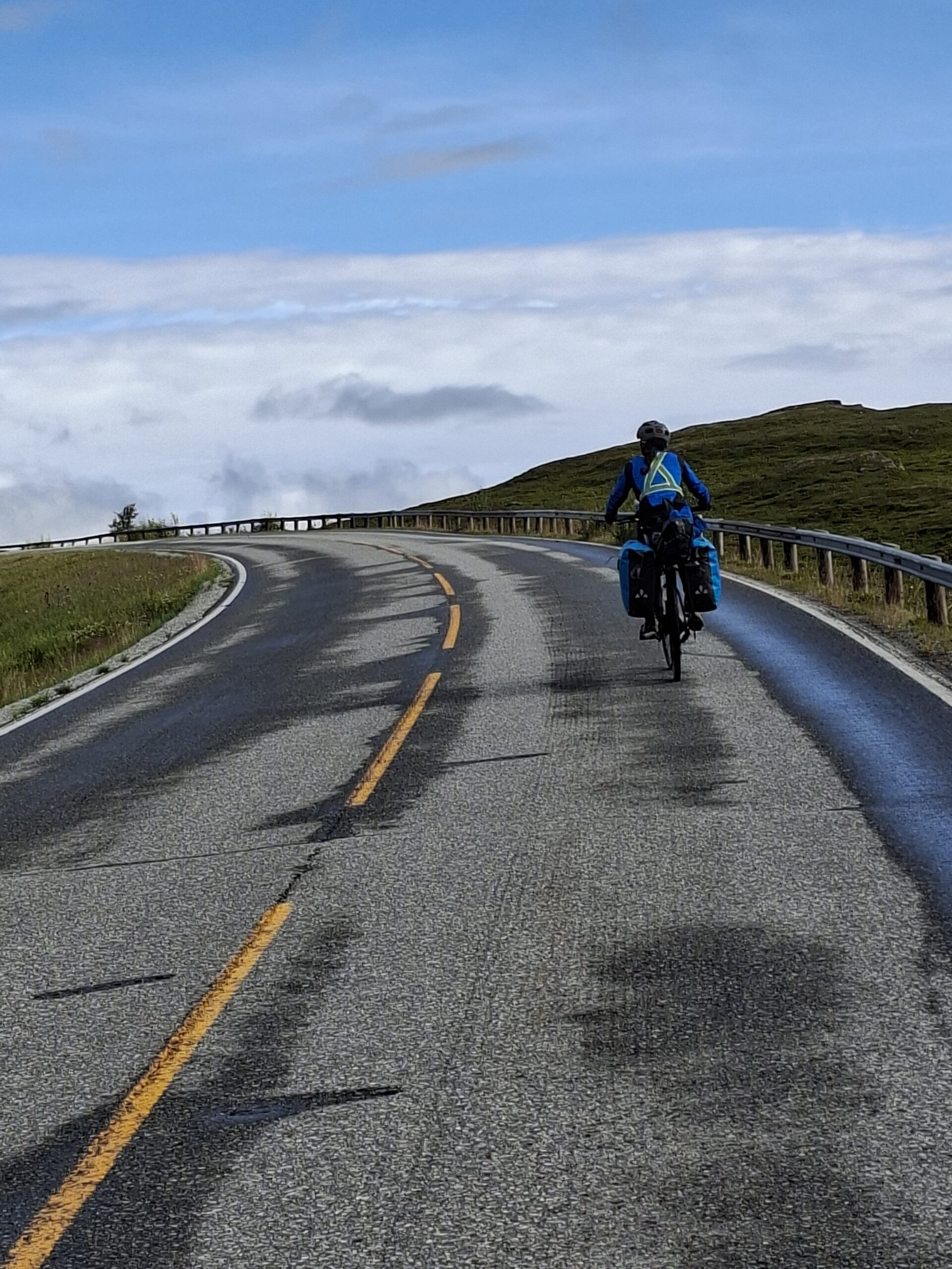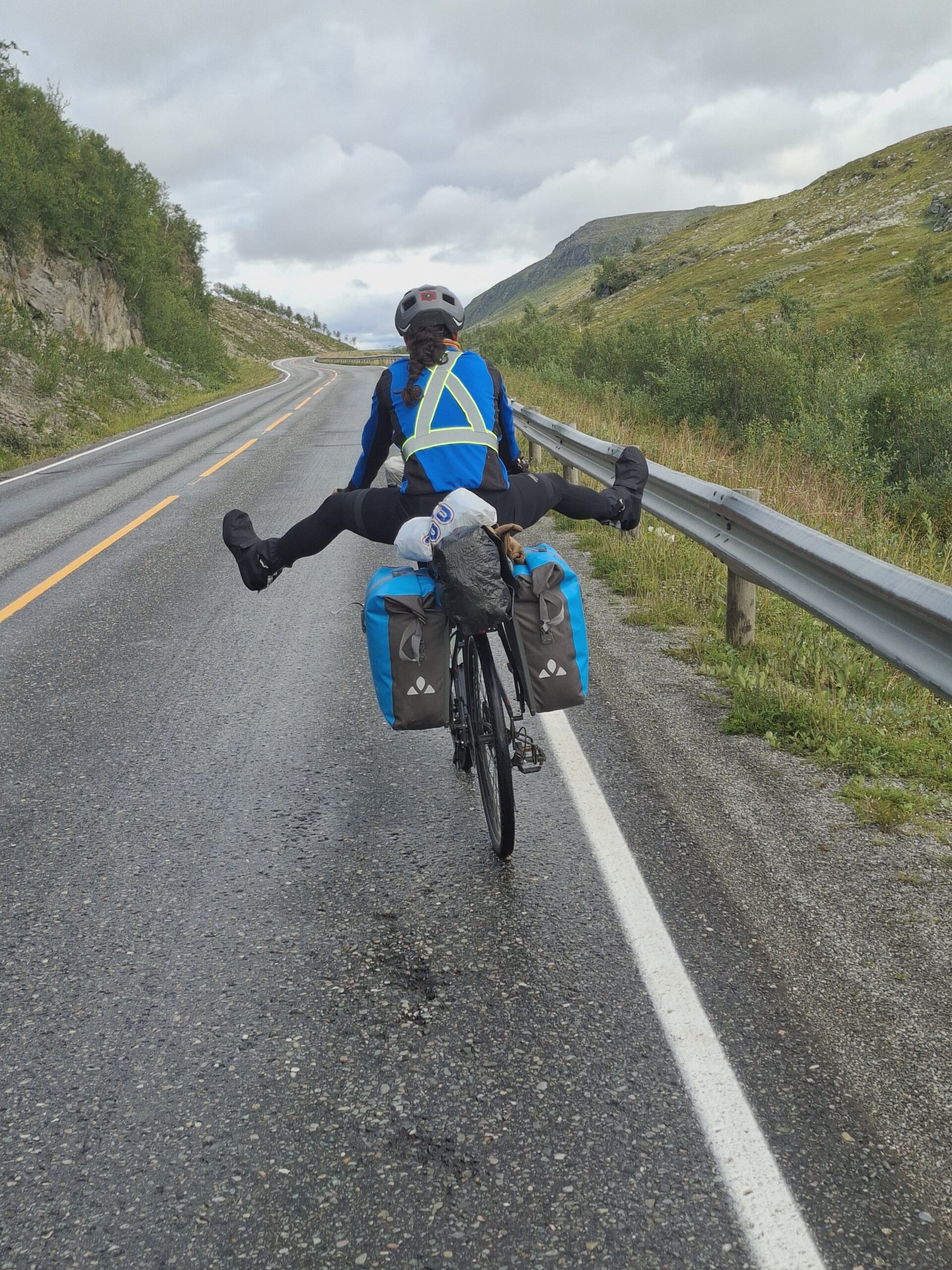 Dejamos atrás Oslo y nos adentramos en paisajes cada vez más verdes y montañosos camino de Trondheim. Noruega no tarda en dejar claro que aquí todo es más grande: los valles, los bosques… y las subidas. Se sube y se baja constantemente, pero, sorprendentemente, se hace llevadero si estás acostumbrada a la bici (y lo dice alguien que no es precisamente fan de las cuestas).Desde Trondheim empezamos a seguir la costa. Nos quedaban unos 2.000 km hasta Nordkapp, enlazando ferris, fiordos y paisajes que parecían irreales. Los túneles, que al principio imponen bastante, resultaron no ser ningún drama: bien iluminados, con arcén o acera y, en algunos casos, hasta con botones para avisar a los coches de que hay ciclistas dentro.