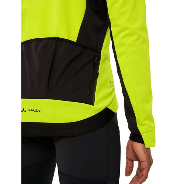 3 bolsillos en la espalda incluyendo un pequeño bolsillo de cremallera, mangas preformadas, espalda con recorte profundo, antideslizante en el dobladillo de la parte trasera, 1 bolsillo en el pecho con cremallera, puños de manga y dobladillo elásticos, elementos reflectantes