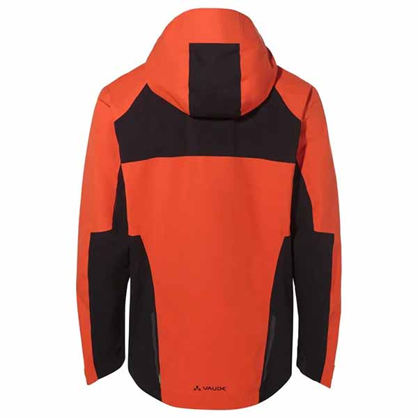 chaqueta de 2,5 capas, bolsillos frontales con cremallera hidrófuga, ventilación del antebrazo con cremallera hidrófuga, mangas preformadas, cremallera frontal invertida hidrófuga con faldón de botones, cordón tensor en el dobladillo regulable a través de los bolsillos, puños con ancho regulable, capucha fija, con ancho regulable y enrollable, capucha apta para casco, color bloque, elementos reflectantes