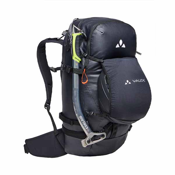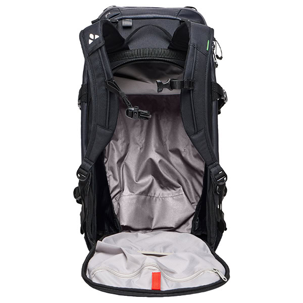 espalda estampada que repele la nieve, tirantes ErgoShape para óptima libertad de movimientos, compartimento para guardar la pala y la sonda en la parte delantera, acceso al compartimento principal en la espalda a través de la cremallera, cinturón lumbar acolchado con bolsillo, fijación de esquís en diagonal, fijación lateral para esquís, fijación de snowboard en el lado frontal, fijación del casco que se puede guardar, compartimento para gafas con relleno de felpa, soporte para piolet, correas de compresión laterales, compartimento de cremallera interior, correa pectoral con silbato, panel informativo sobre situaciones de emergencia alpinas en el compartimento principal, salida para sistema de hidratación