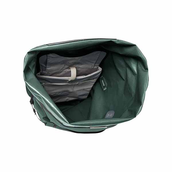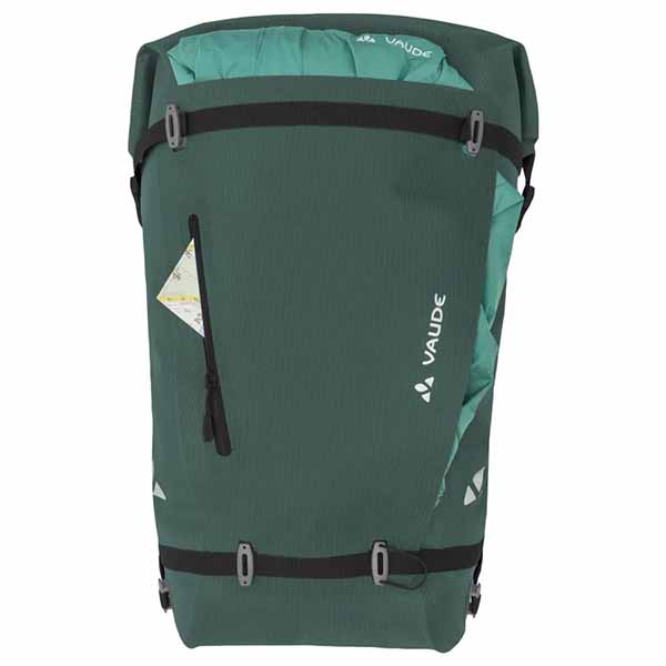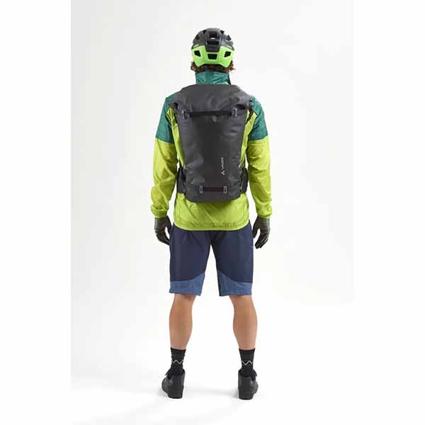 cierre enrollable impermeable, compartimento principal con compartimento integrado para portátil (35 x 28 x 3 cm) y compartimentos de malla, bolsillo para objetos de valor de cremallera extraíble, correa de compresión desmontable arriba, cinturón lumbar acolchado con bolsillo, soporte para el casco con función de equipaje adicional, logo reflectante para mejor visibilidad