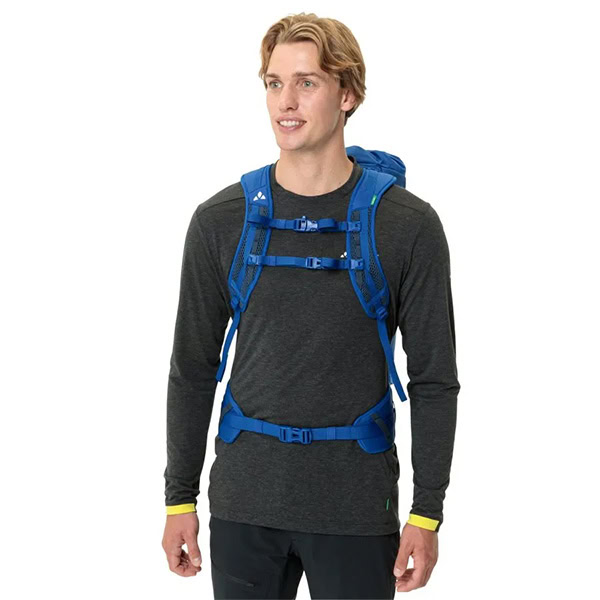 tirantes Ergoshape FoM, tirantes centralizables para una máxima libertad de movimientos, dos ligeras varillas de aluminio adaptables para estabilizar la espalda, varillas de aluminio extraíbles para reducir el peso, espalda estampada que repele la nieve, ligero cinturón lumbar desmontable, Solapa del cordón de cierre para cerrar la mochila rápidamente., bolsillo exterior de cremallera , correas de compresión laterales, , correa de compresión superior que se puede guardar/soporte de cuerda, soporte para piolet, lazo para fijar el equipamiento y el casco, correa pectoral con silbato, salida para sistema de hidratación, panel informativo sobre situaciones de emergencia alpinas en el compartimento principal