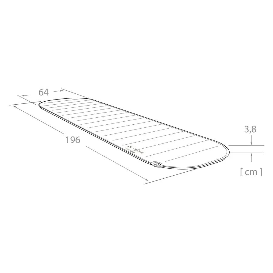 esquinas redondeadas para conseguir una perfecta combinación entre peso ligero y máximo confort, el núcleo de espuma y el material superior elástico son muy ergonómicos y se adaptan a cada postura para dormir, perforaciones horizontales en la espuma a lo largo de toda la colchoneta para reducir el peso y conseguir una mejor inclusión del aire, válvula plana VAUDE de manejo sencillo, material elástico 30D especialmente suave y agradable, robusto material 75D con cardado, con funda adecuada para transporte y almacenamiento, con kit de reparación para emergencias, Valor R (resistencia termal): 4.5, temperatura: -14°C / 7°F, Medida según el estándar activo ASTM F3340-18, Pump Pillow: disponible como opción, modelo: 12826-225, Pump Sack: disponible como opción, modelo: 12828-227