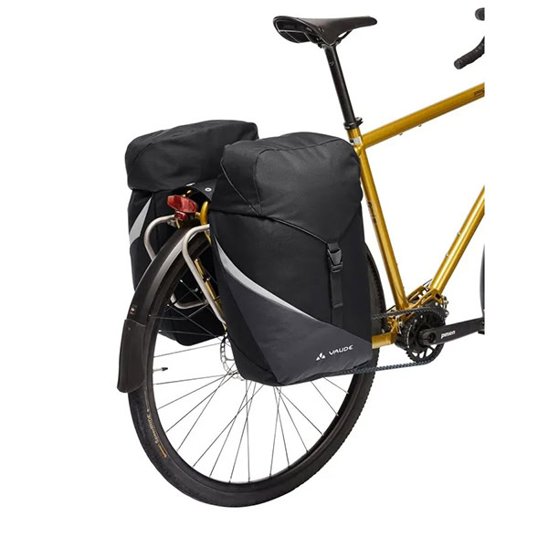 Práctica bolsa doble para rueda trasera, para excursiones #sistema de alforja, las bolsas están unidas entre sí #posibilidad de montaje para distintos sistemas de fijación #fabricación respetuosa con el medio ambiente con predominio de material reciclado
